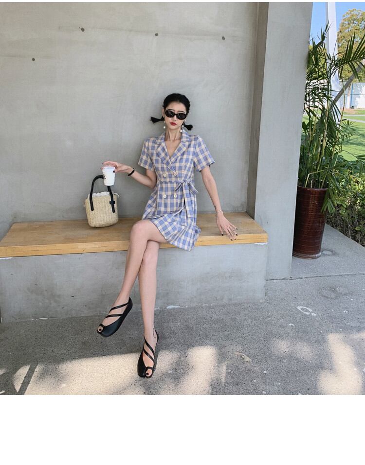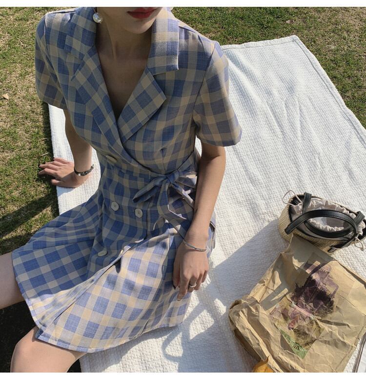 今の季節にちょうどいい 夏 韓国語版 高品質 レトロ 格子縞 スーツネック ワンピース 半袖 バンディングKKIUJH12701a