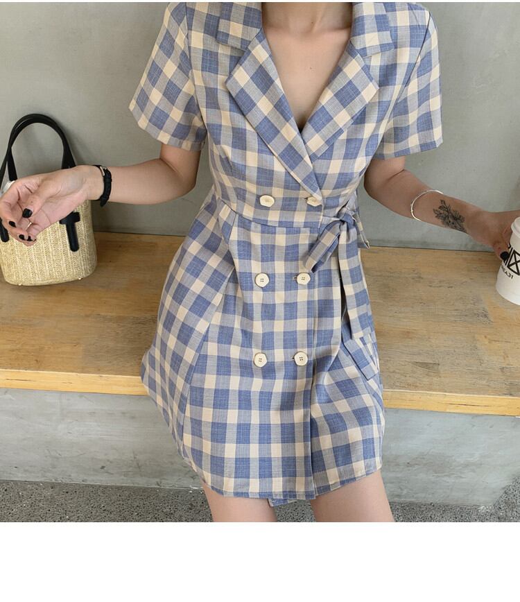 夏 韓国語版 高品質 レトロ 格子縞 スーツネック ワンピース 半袖 バンディング