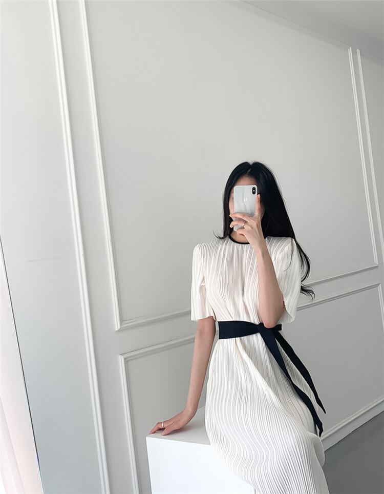 通勤する 気質 エレガント 簡約 ラウンドネック プリーツ バンディング 半袖 ワンピース