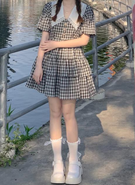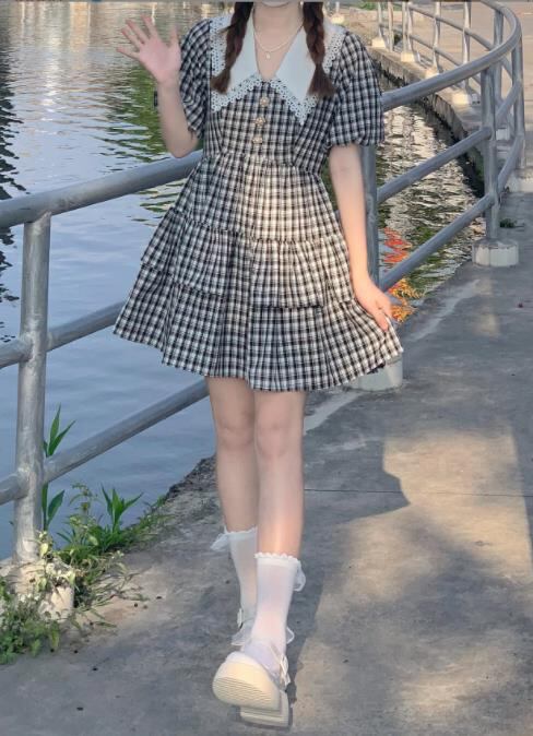 春夏新作 女 レディース ハイウエスト 半袖 チェック柄 ミニ ワンピース ドレス 台型スカートMKUIHT25126101