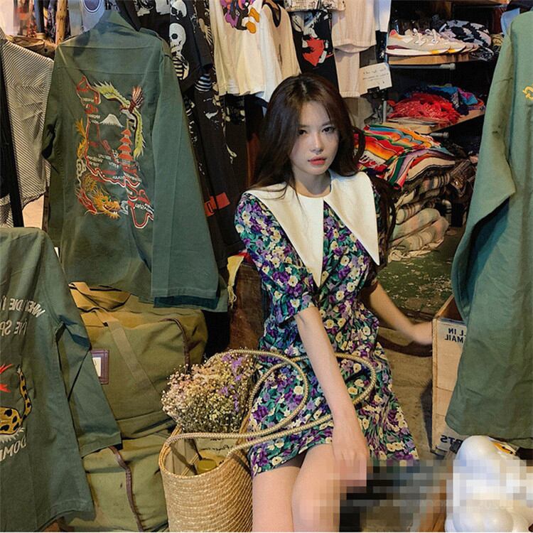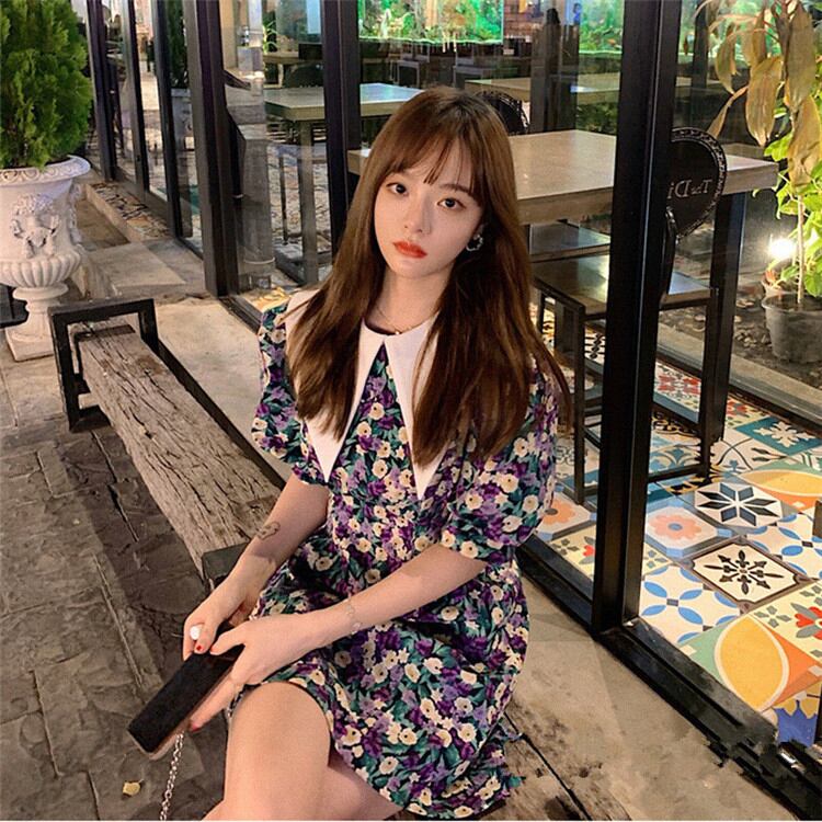 今の季節にちょうどいい とがった襟 花柄ワンピ パフスリーブ 半袖 ハイウエスト 小さい新鮮な sweet系MKUIHT25126145a