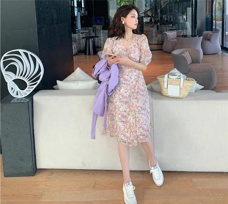 シフォン 半袖 Vネック 花柄ワンピ 小さい新鮮な sweet系 気質 おしゃれな 大人気 お出かけ