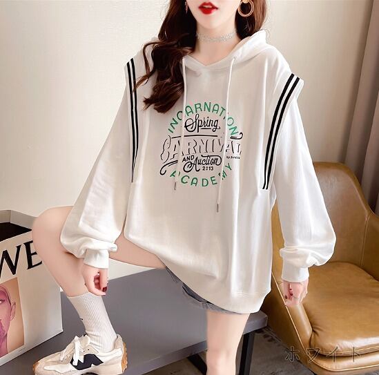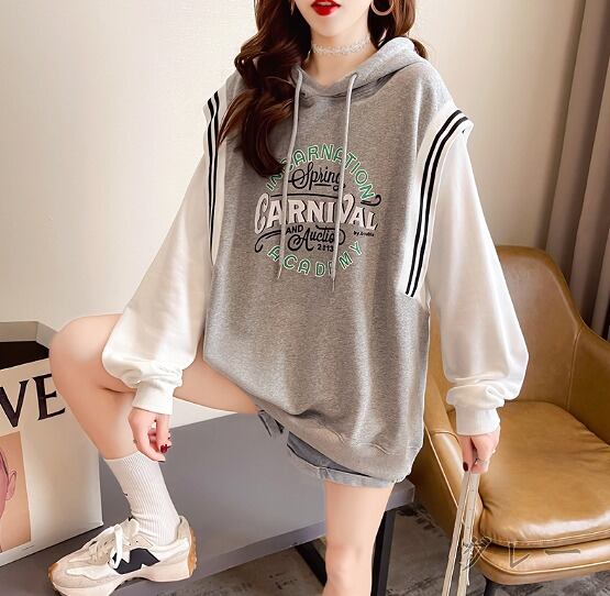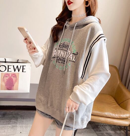 全3色 スウェット トレーナー 裏起毛 フェイク 切り替え 体型カバー 着痩せ 帽子付き 【大きいサイズあり】★# QWMKIG36952