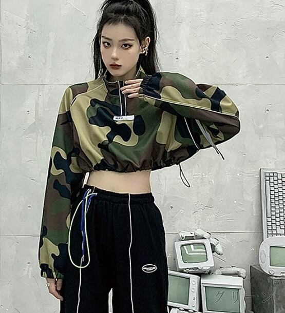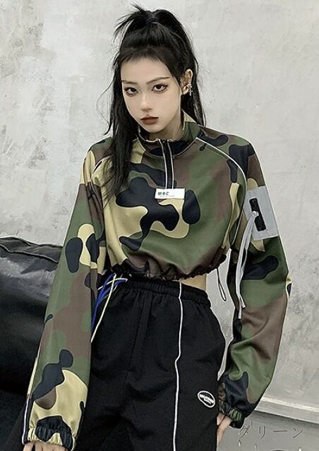 スウェット トレーナー ショット丈 長袖 バイカラー 体型カバー 着痩せ 迷彩 ミリタリー カジュアル★# DSXXD7853
