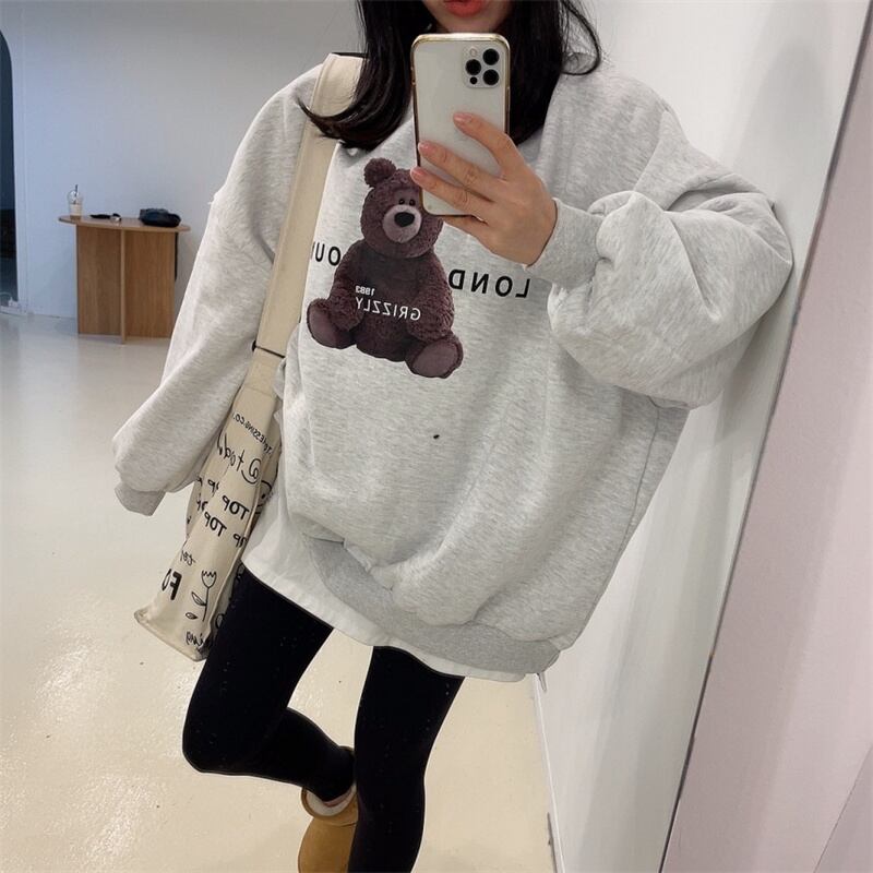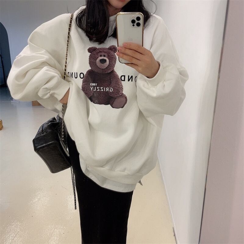 秋冬新作 レトロ ゆったり 長袖 プリント くまちゃん アルファベット プルオーバー トレーナー★# JJKIEB77