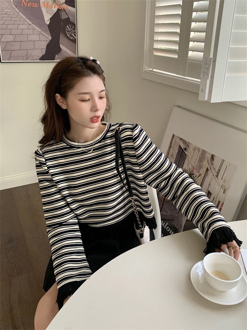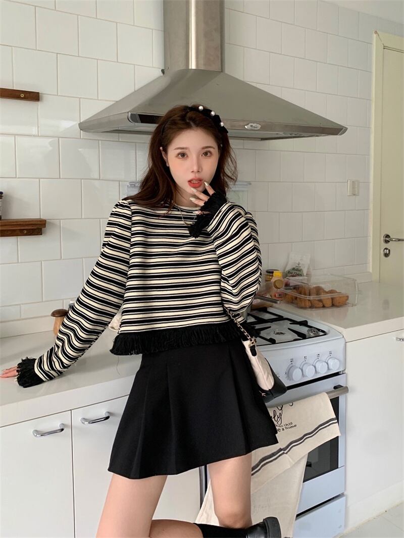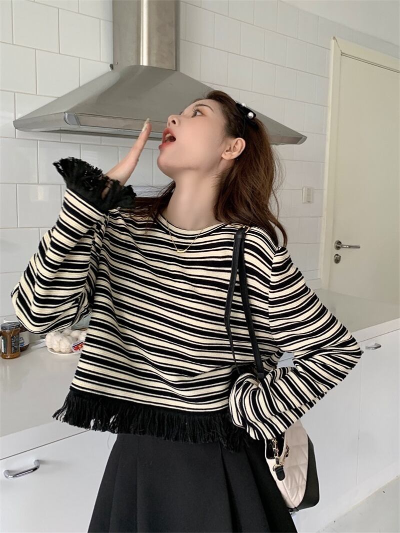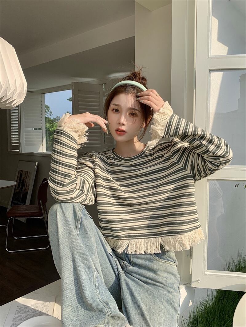 秋冬 新作 カジュアル レトロ ストライプ柄 タッセル プルオーバー トレーナー★# GFEW863255