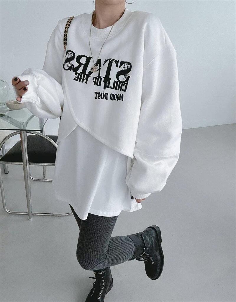 秋冬 新作 レトロ 設計感 裏起毛 長袖 配色 偽2枚 トレーナー★# GGFR23969