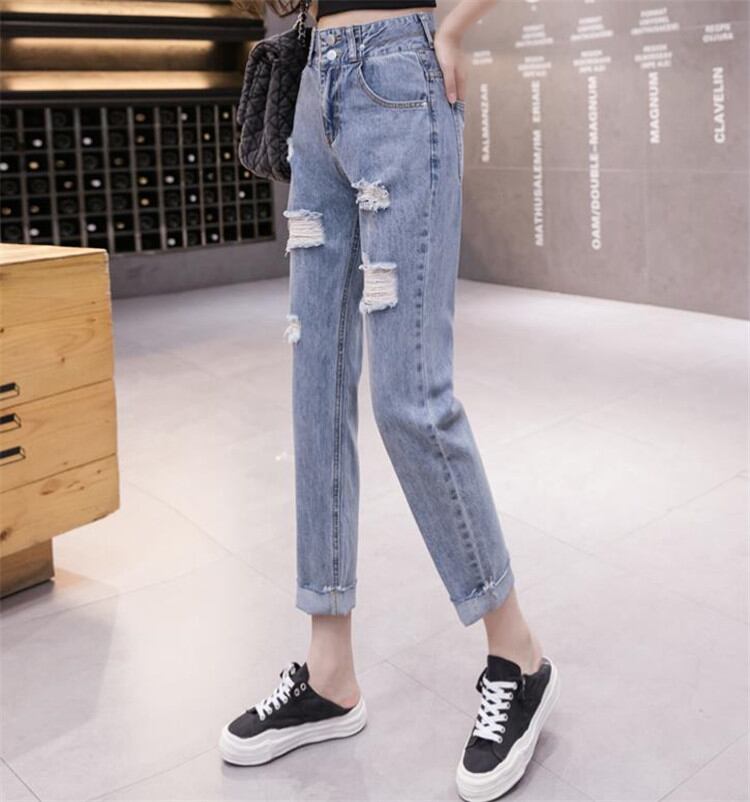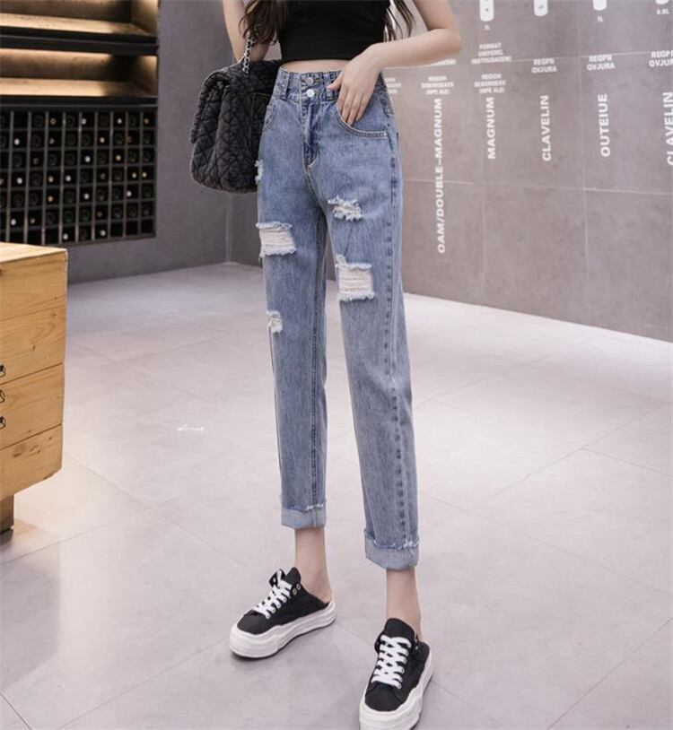 破れ ジーンズ ハイウエストゆったりする スリム ストレートレッグトレンド