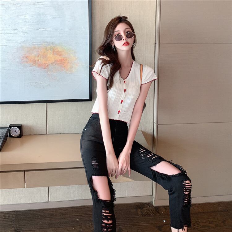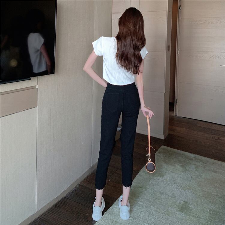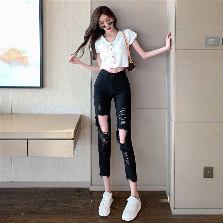 レビュー続々 ダメージデニムパンツ ロングパンツ 破れ ハイウエスト