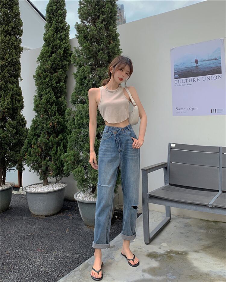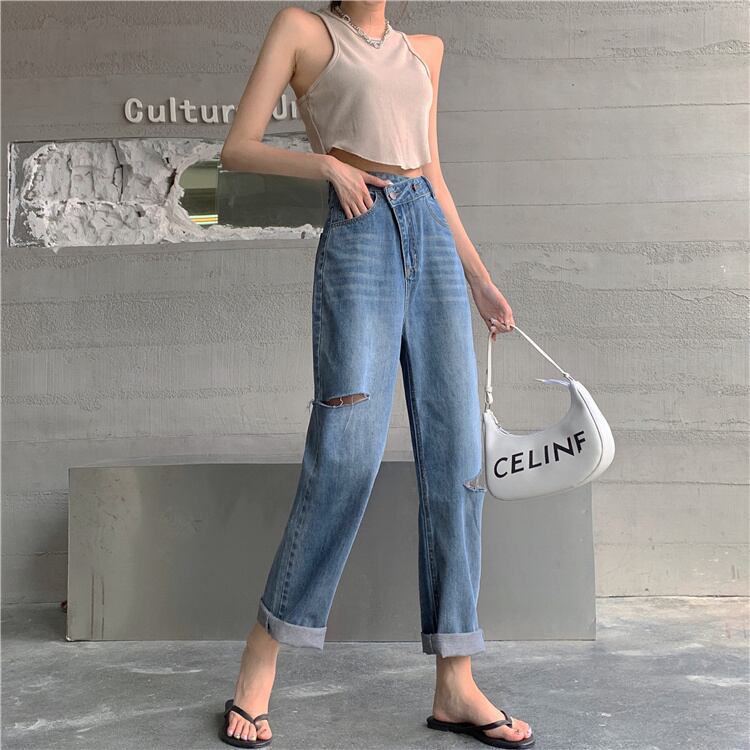 韓国ファッション 韓国版 破れ シン ジーンズ ゆったりする ファッション カジュアル