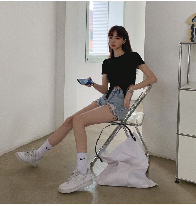 第一印象:素晴らしい 韓国ファッション 破れ デニム チェーン ショートパンツ ハイウエスト