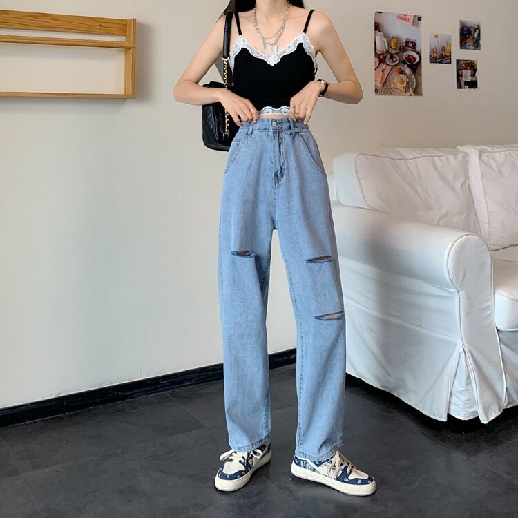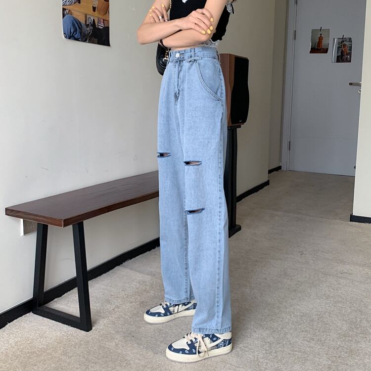 大人っぽく、そして美しく 百掛け ゆったりする シン ハイウエスト 破れ ワイドレッグ ジーンズ