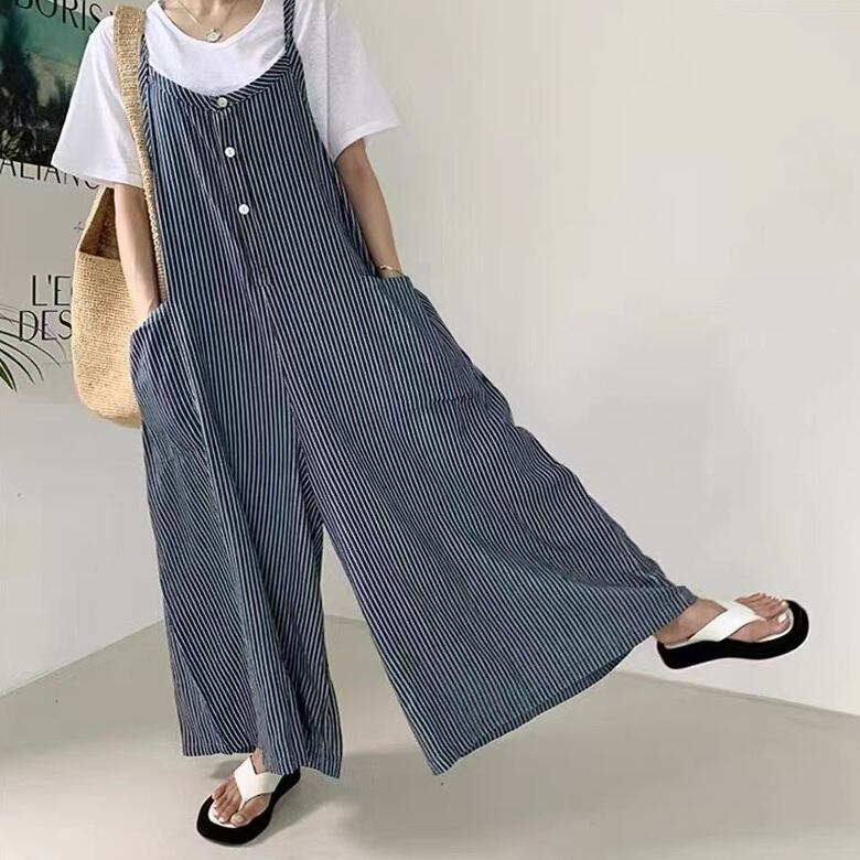 【夏 新作】カジュアル ノースリーブ ストライプ柄 9分丈 ハイウエスト コンビネゾン