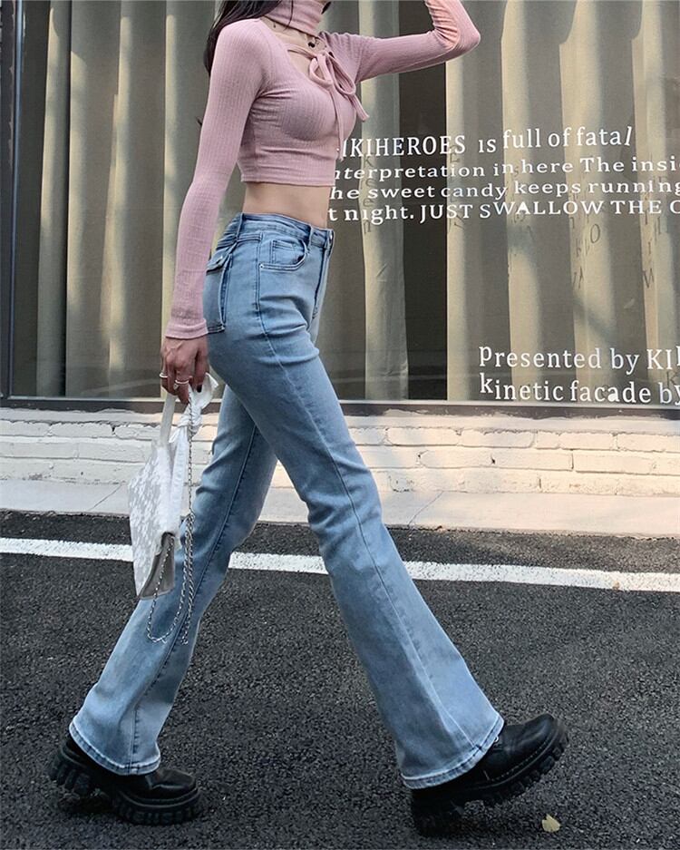 ヤングスタイル バックポケットストレートマイクロフレアパンツ ハイウエスト デニム ロングパンツ