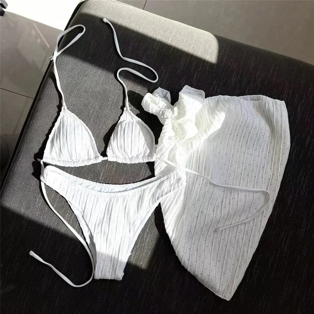 女性用ホルターカバー付きホワイト水着、マイクロひもビキニセット、質感の水着、ひもスーツ、ビーチウェア、3個 セパレート水着 ビキニ レディース T240618202708_05