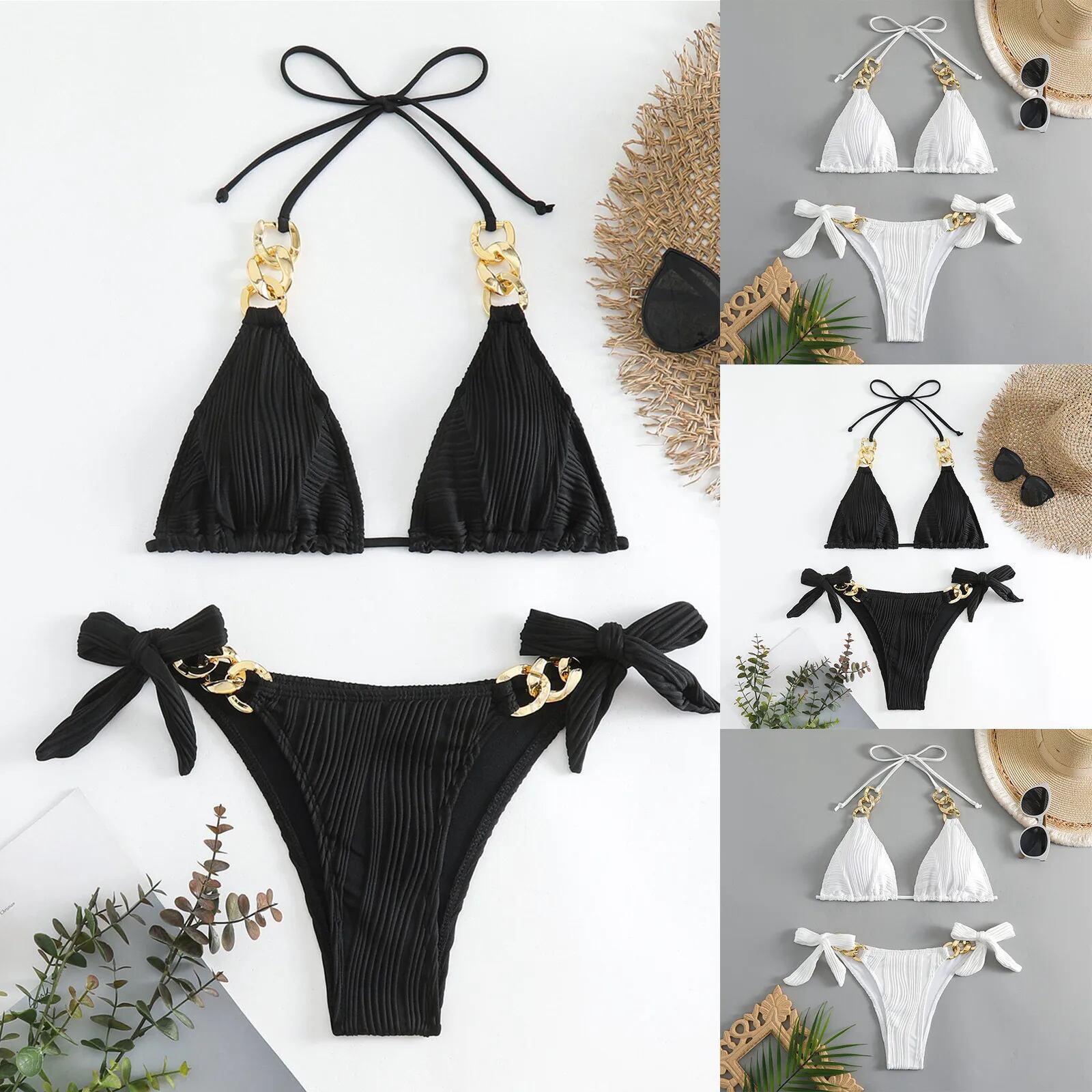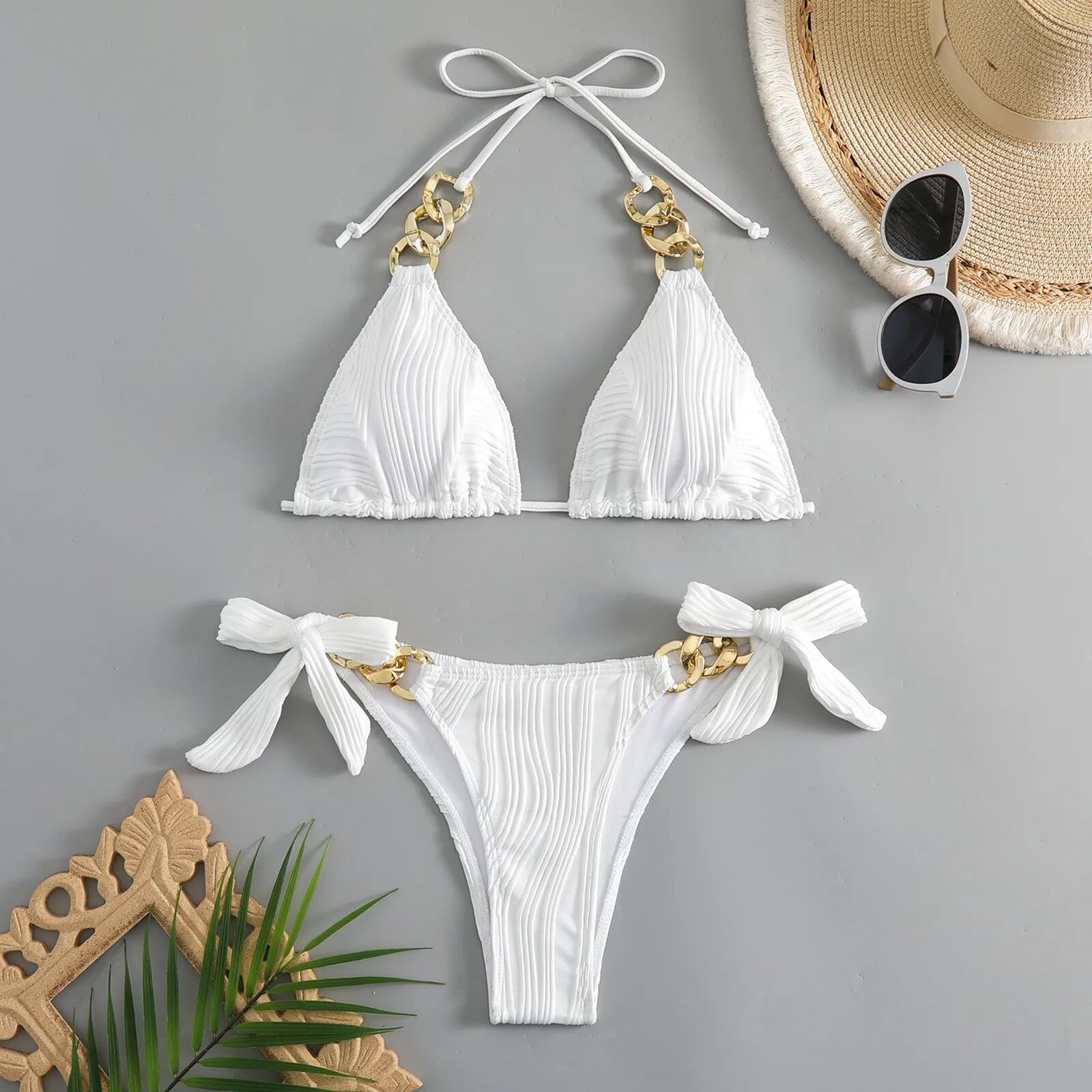 女性用単色水着,ハンギングカラー,ハイウエスト,ビーチビキニ,セクシーなテクスチャー,新しいファッション,夏,2個,2024 セパレート水着 ビキニ レディース T240618204048_02