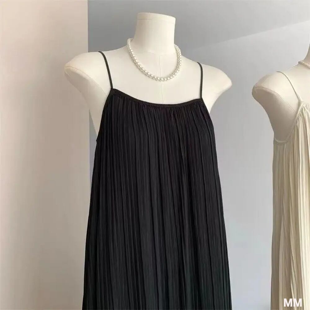 女性の単色プリーツスリングドレス、ミドル丈、ルーズ、ヴィンテージ、エレガント、シンプル、韓国スタイル、y2k、ulzzang、ファッション、夏 韓国系水着 セパレート水着 ワンピース水着 T240626112729_01
