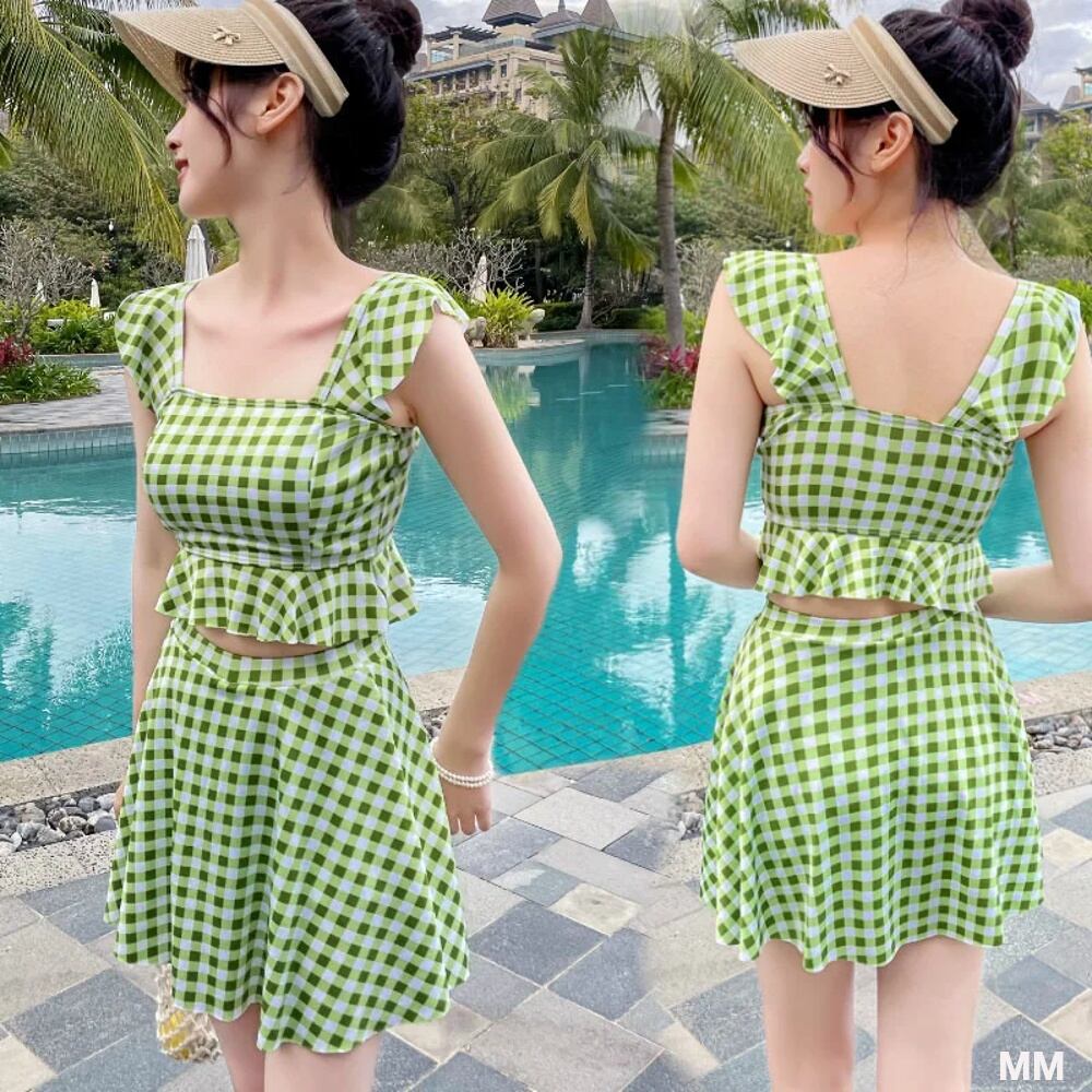 女性用ツーピースフリルチェック水着,ビーチウェア,ハイウエスト,和風,韓国スタイル 韓国系水着 セパレート水着 ワンピース水着 T240626112939_03