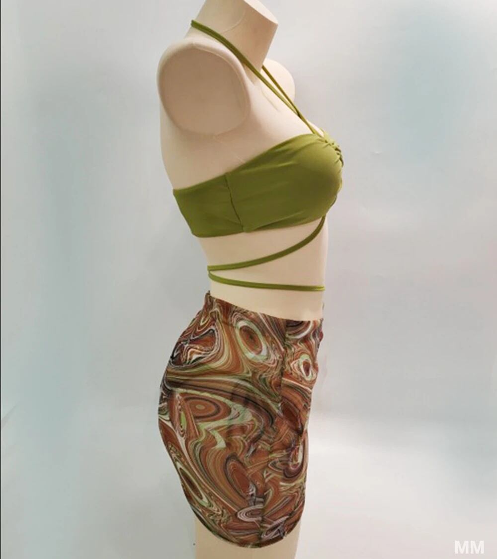 モデル番号:Halter Thong Bikini 3 Pieces Solid Bikini Set With Printed Skirt