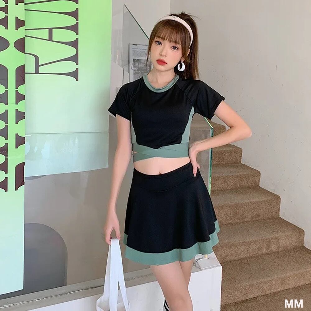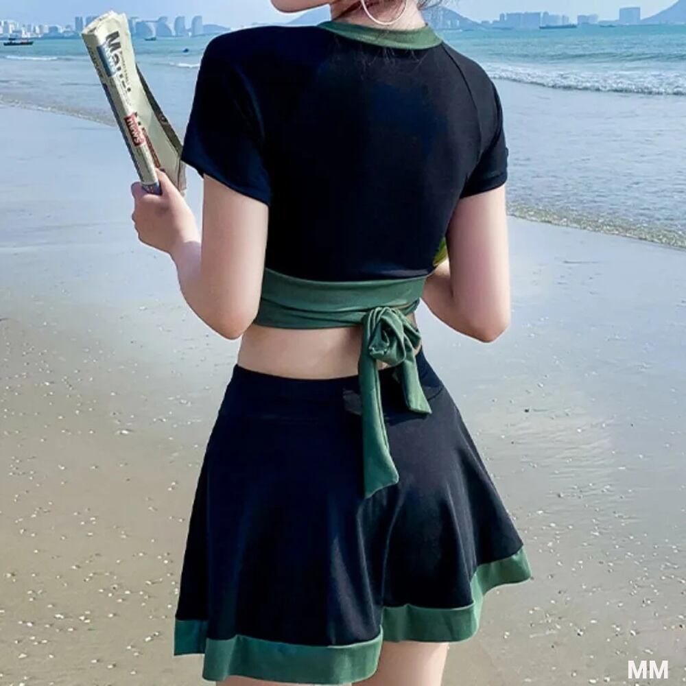 女性用ビーチビキニセット,韓国風パッチワーク,スリム,ラウンドネック,半袖,休暇用,レトロフィット 韓国系水着 セパレート水着 ワンピース水着 T240626144018_01