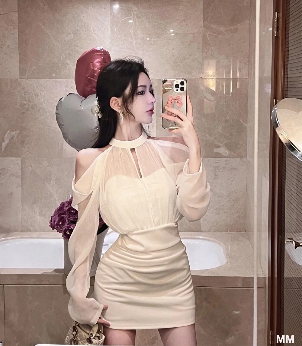 女性の韓国のホルタードレス、スリムなガーゼ、裸の肩、長袖、ハイウエスト、プリーツドレス、エレガントなファッション、夏、新しい、2024 韓国系水着 セパレート水着 ワンピース水着 T240626160529_01