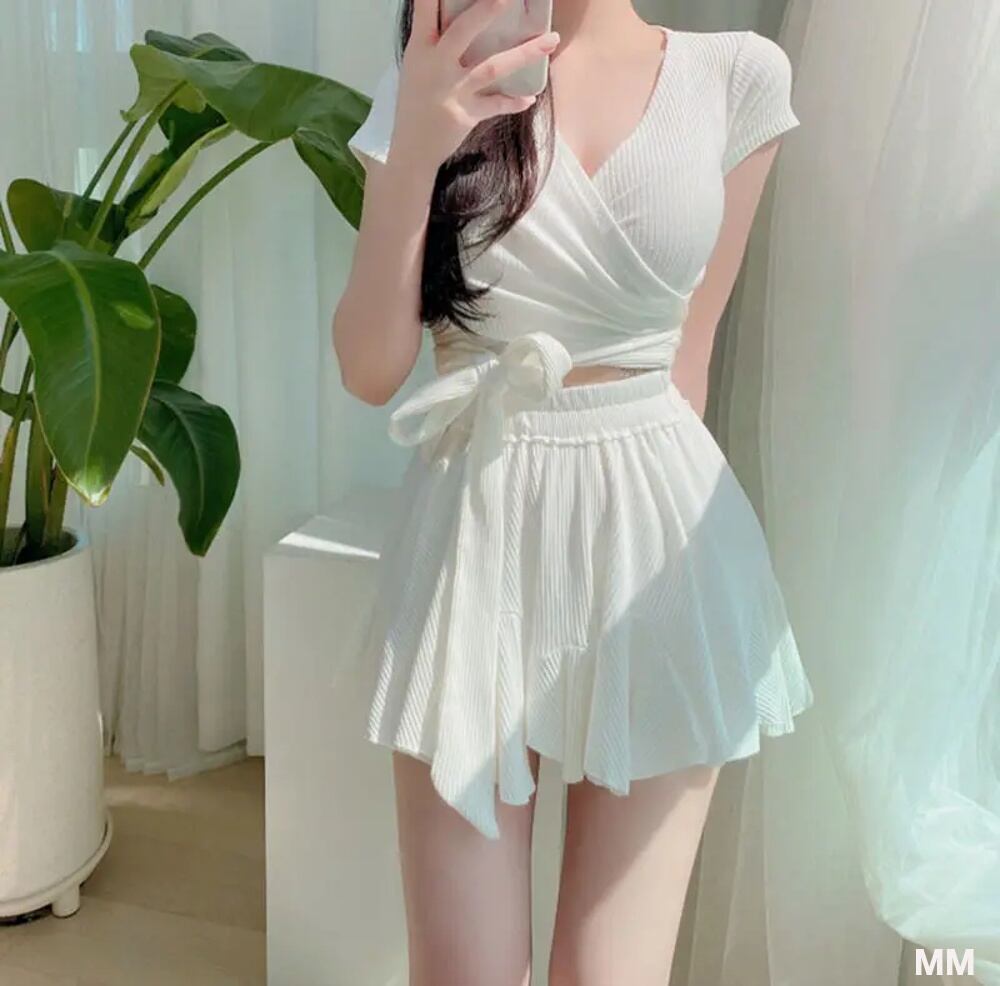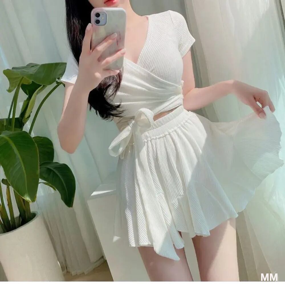 ツーピースの半袖パッド入り水着,スカート付き半袖トップス,セクシー,韓国のファッション 韓国系水着 セパレート水着 ワンピース水着 T240626104750_03
