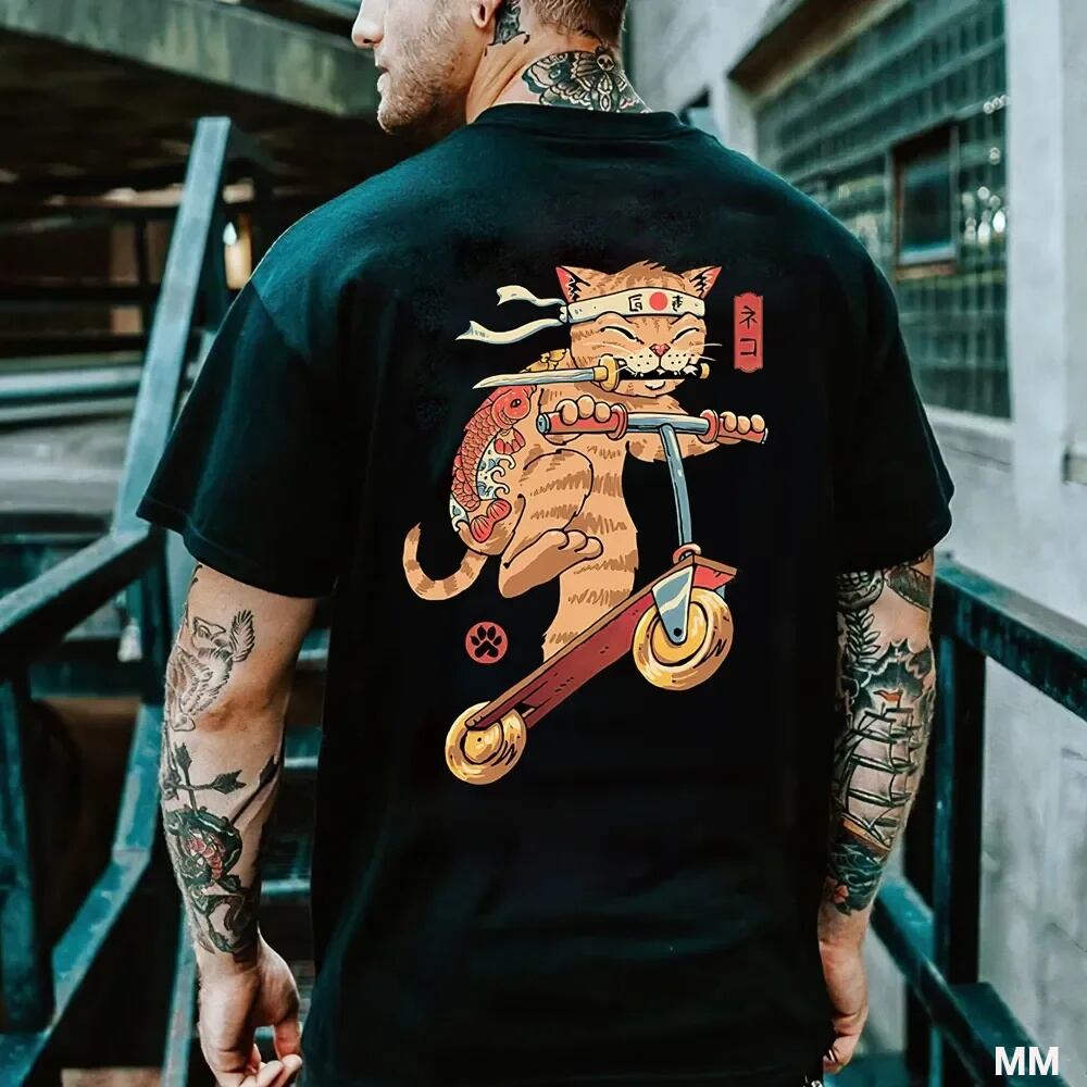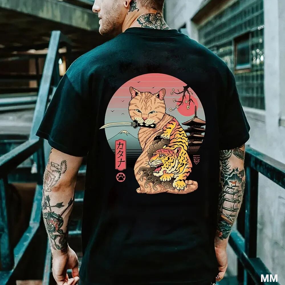 男性用サムライ猫柄Tシャツ,半袖Tシャツ,ラウンドネック,カジュアル,ルーズ,ヴィンテージ,アウトドア,ヒップホップスタイル Tシャツ シャツ T240619134017_10