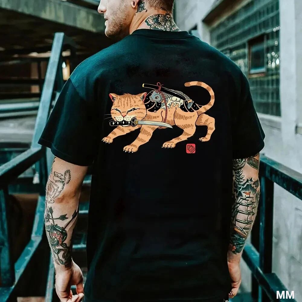 男性用サムライ猫柄Tシャツ,半袖Tシャツ,ラウンドネック,カジュアル,ルーズ,ヴィンテージ,アウトドア,ヒップホップスタイル Tシャツ シャツ T240619134017_13