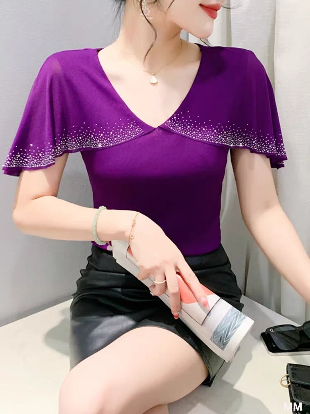 女性用半袖Tシャツ,フリル付きトップス,Vネック,ストレッチ,ダイヤモンド付き,実際の写真,夏 Tシャツ シャツ T240619134038_01