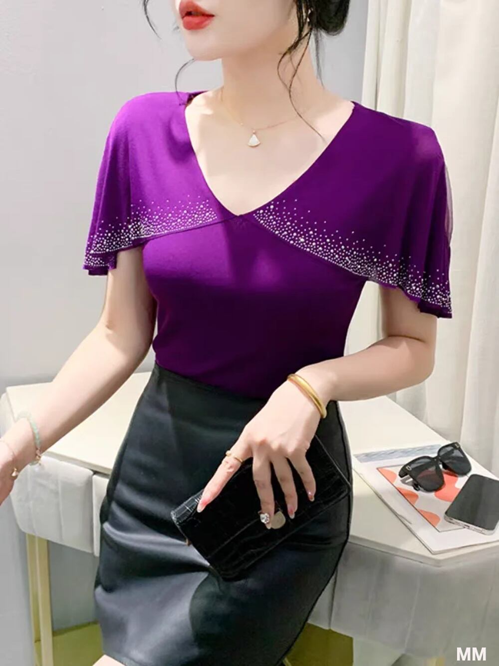 女性用半袖Tシャツ,フリル付きトップス,Vネック,ストレッチ,ダイヤモンド付き,実際の写真,夏 Tシャツ シャツ T240619134038_03