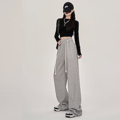 ドレープ付きグレーブルーワイドレッグパンツレディース秋の新作ハイウエストカジュアルパンツスリムストレートレッグスウェットパンツレディースパンツ★1