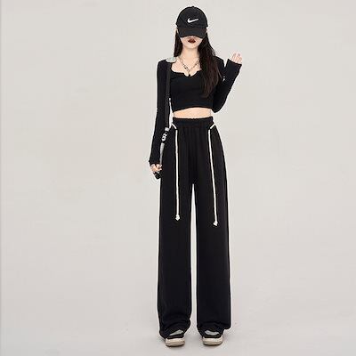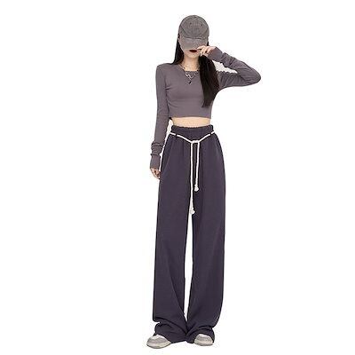 ドレープ付きグレーブルーワイドレッグパンツレディース秋の新作ハイウエストカジュアルパンツスリムストレートレッグスウェットパンツレディースパンツ★2