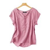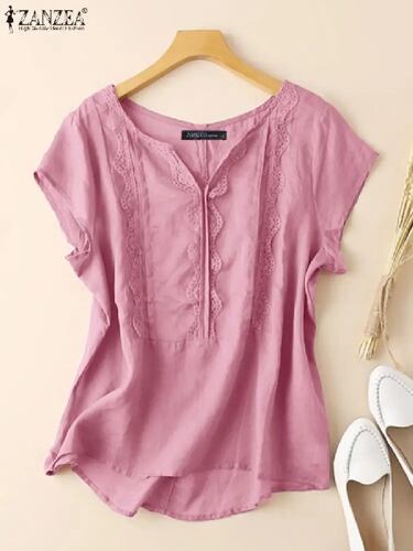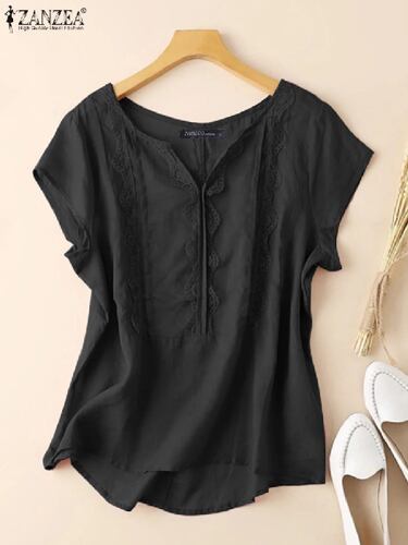 Zanzea-レディースレースステッチトップ、Vネックブラウス、ルーズ、ヴィンテージ、単色、半袖、カジュアル、休日、夏、2022