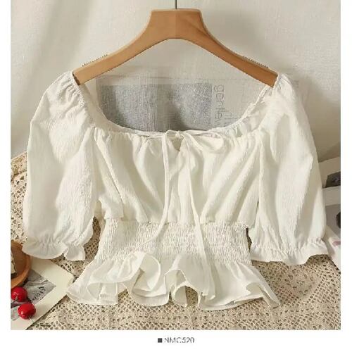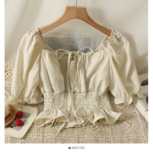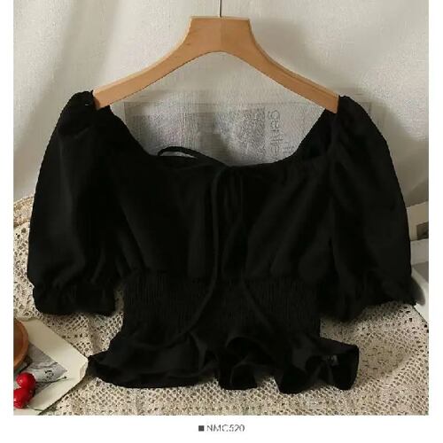 フレンチスタイルのフリルシャツ,半袖,伸縮性のあるウエスト,ショートトップ,痩身,カジュアル,甘い,エレガント,女性のブラウス,新しいコレクション