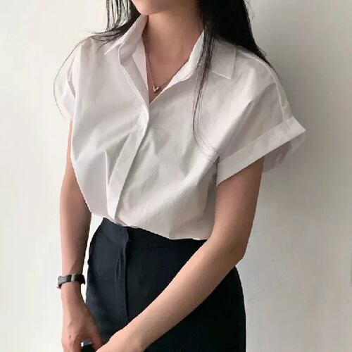 女性用半袖ルーズブラウス,夏,ラペル,ボタン付き,ミニマリスト