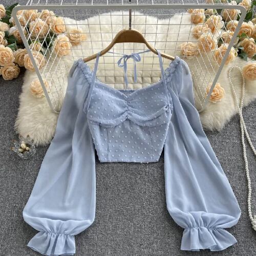 長袖とホルターネックの水玉模様のブラウス,女性用ショートトップ,ホルターネック,伸縮性のあるウエスト,フランスのファッション,ビーチトップ,夏,2024