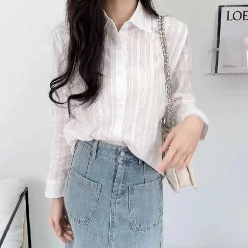 女性用長袖ホワイトシャツ,ラペル,シンプル,ストライプ,エレガント,ストライプ,カジュアルブラウス,ルーズフィット,オフィス,春,夏,ニュー,1991