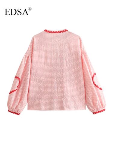 Edsa-女性のエレガントな市松模様のシャツ、レースアップ、長いパフスリーブ、Vネック、愛のプリント、女性のブラウス、女性のシックなソフトトップ、夏