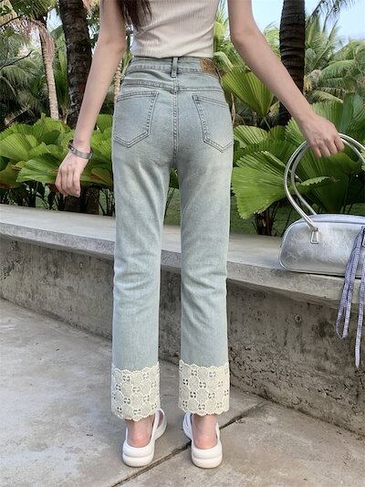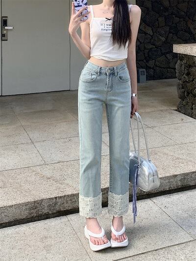 2024春夏パンツ デニム ジーンズ クロップド丈 アンクル丈 レース ストレート ハイウエスト 脚長効果 美脚効果 細見え 春 水色 ライトブルー カジュアル おしゃれ かわいい 韓国ファッション