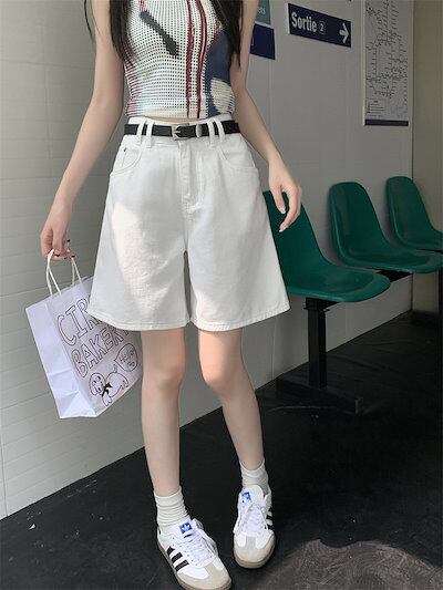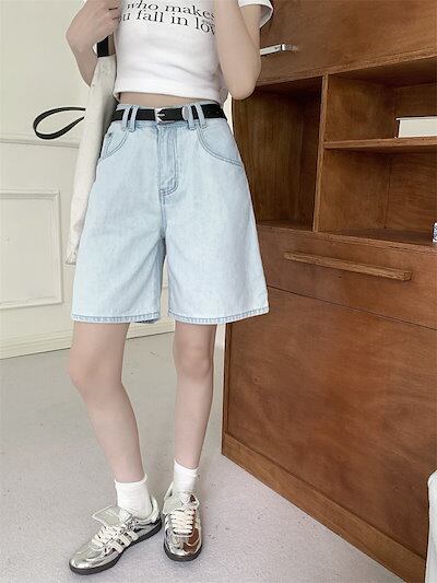 2024 春夏パンツ ハーフパンツ デニム ジーンズ ワイド ハイウエスト 脚長効果 美脚効果 細見え ゆったり 夏 白 水色 カジュアル かわいい おしゃれ 韓国ファッション レディース お出かけ