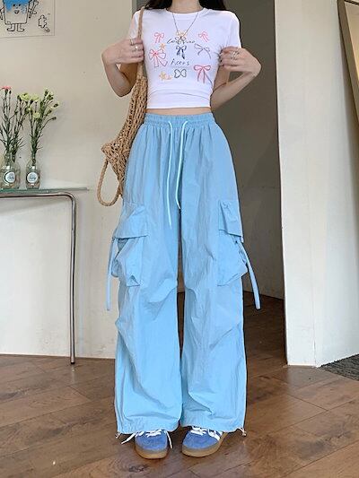 2024夏 韓国パンツ ロング丈 モップパンツ ワイド ストレート ウエストゴム ハイウエスト 美脚効果 脚長効果 細見え 夏 黒 水色 白 韓国ファッション レディース かわいい おしゃれ カジュア