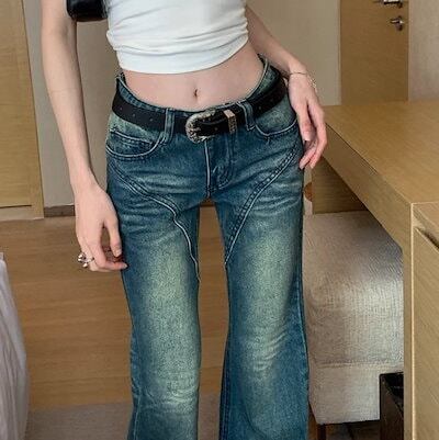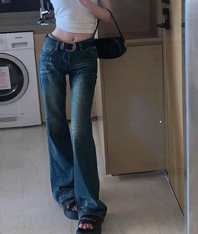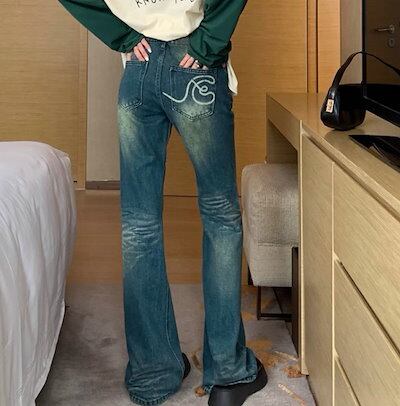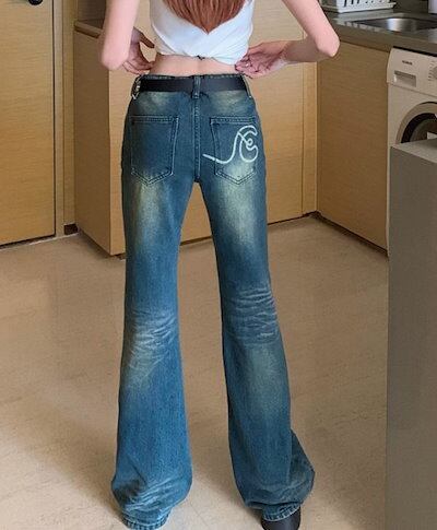 2024春夏 アメリカン パンツ デニム ブルー ジーンズ ロング丈 スキニー レッグ加工 ハイウエスト 脚長効果 美脚効果 細見え 秋 カジュアル 韓国ファッション お出かけ1