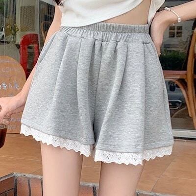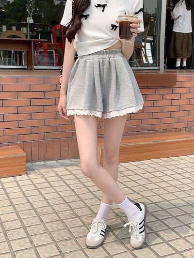 2024 春夏パンツ ショート丈 レース ウエストゴム ハイウエスト 脚長効果 美脚効果 細見え ゆったり 夏 黒 かわいい カジュアル 韓国ファッション レディース お出かけ