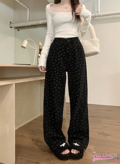 2024春夏パンツ ワイド ストレート 花柄 ハイウエスト 脚長効果 美脚効果 細見え 春 ブラック 黒 甘辛 かわいい おしゃれ カジュアル 韓国ファッション レディース お出かけ