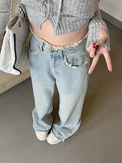 2024 春夏 デニムパンツ ハイウエスト ストレート ボトムス ジーンズ ワイドパンツ カジュアル 韓国ストリート加工