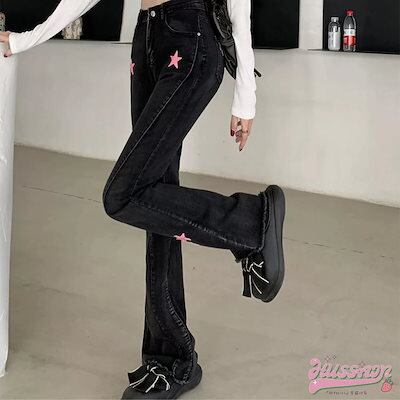 2024春夏 ハイウエスト パッチワーク ジーンズ ボトムス デニムパンツ フレイドヘム 脚長 スタイルアップ ジーパン カジュアル ブラックデニム