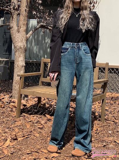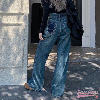 パンツ デニム ジーンズ モップパンツ ステッチ ワイド ストレート ハイウエスト 脚長効果 美脚効果 細見え 春 カジュアル 韓国ファッション レディース お出かけ