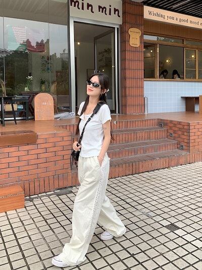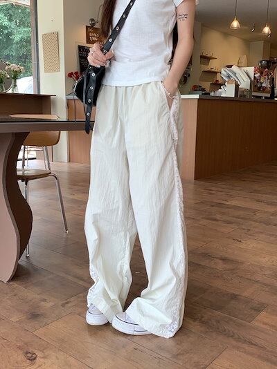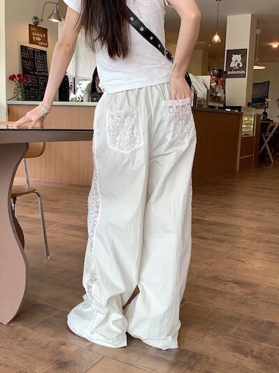 2024春夏パンツ ロング丈 モップパンツ レース ワイド ストレート ハイウエスト 脚長効果 美脚効果 細見え ゆったり 夏 白 ホワイト カジュアル かわいい おしゃれ 甘辛 韓国ファッション レ