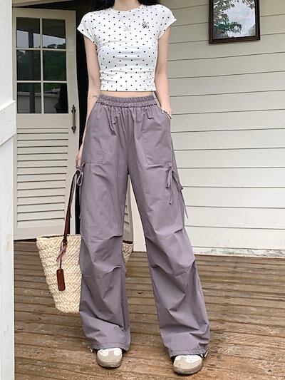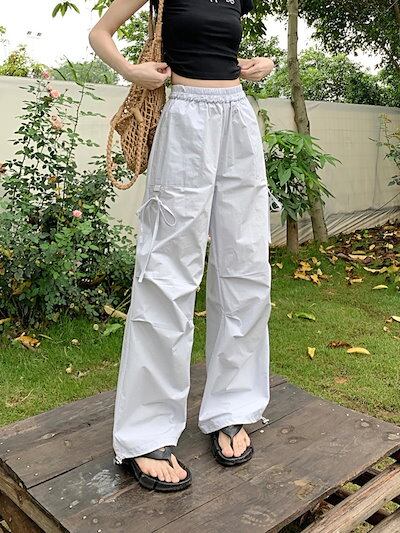 2024春夏パンツ ロング丈 カーゴパンツ ワイド ストレート ウエストゴム ハイウエスト 美脚効果 脚長効果 細見え 夏 白 黒 青 韓国ファッション レディース かわいい おしゃれ カジュアル お