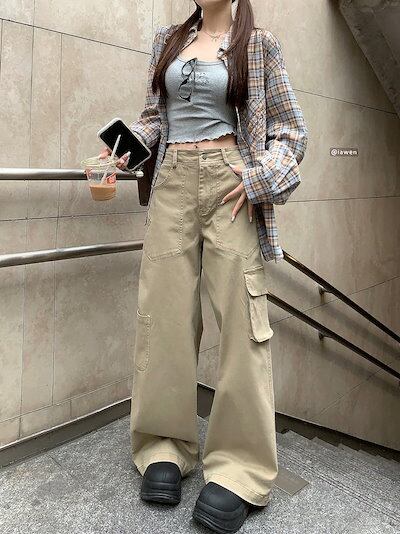 2024春夏パンツ カーゴパンツ ポケット ワイド ストレート ハイウエスト 脚長効果 美脚効果 細見え ベージュ カジュアル おしゃれ かわいい 韓国ファッション レディース お出かけ